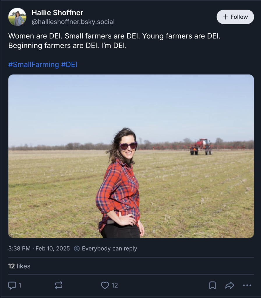 Shoffner has cast herself both as a beneficiary of DEI and as a white woman who has benefited from a rigged system. “Women are DEI. Small farmers are DEI. Young farmers are DEI. Beginning farmers are DEI. I’m DEI,” she posted to the liberal social media site Bluesky in February 2025. At the same time, she has said that, because she is white, she has a “responsibility” to make the agriculture industry “more equitable” for others.