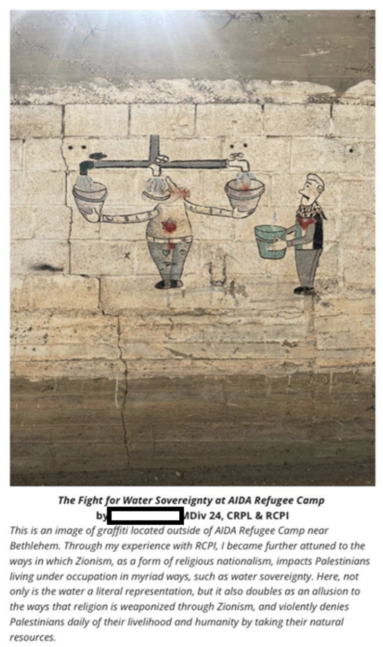 The timing of Moore’s and Rashid’s abrupt departures is also noteworthy. Roughly a week prior, Harvard promised greater protections for Jewish and Israeli students in order to settle a lawsuit that accused the university of failing to address “severe and pervasive” anti-Semitism on campus. In their complaint, six Jewish students pointed to RPL’s statement as well as the program’s promotion of a student’s photo of graffiti near Bethlehem showing “a Jewish individual with a stereotypical elongated nose … hoarding water from three faucets simultaneously, while an individual wearing Palestinian garb stands nearby.” The photographer said it showed how “religion is weaponized through Zionism, and violently denies Palestinians daily of their livelihood and humanity by taking their natural resources.”