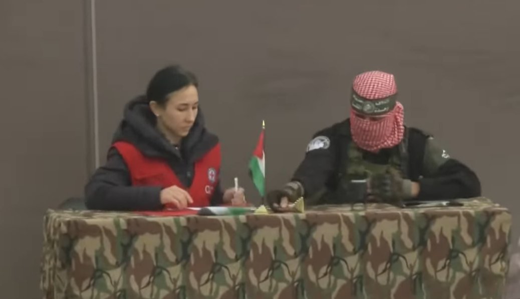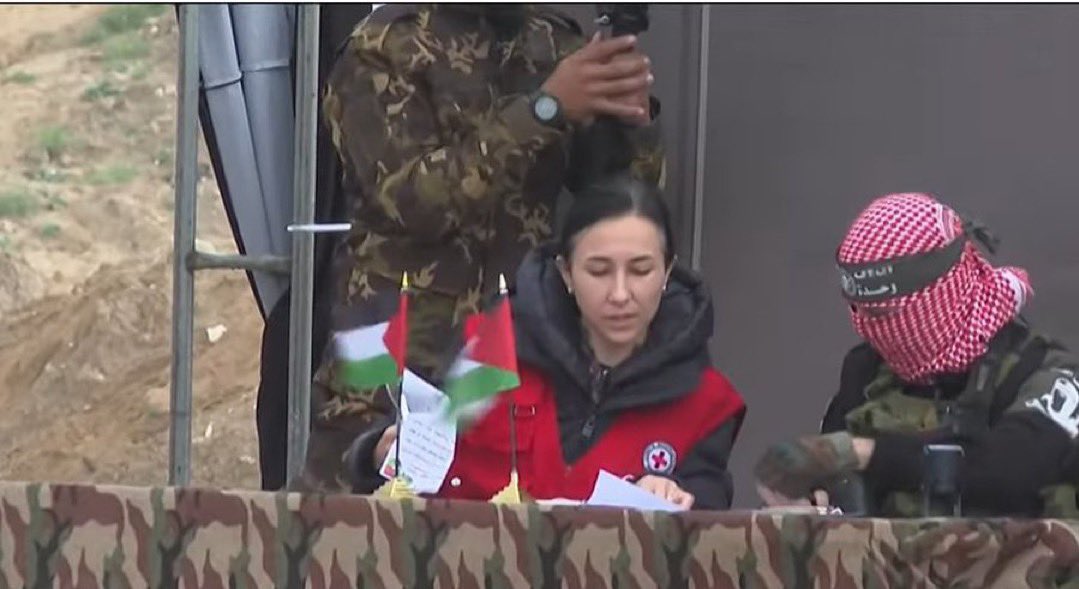 The ICRC sparked outrage when, roughly two weeks ago, officials Nour Khadam and Stephanie Eller joined uniformed Hamas terrorists on stage to participate in a propaganda ceremony surrounding the release of Israeli hostages. The pair signed documents and shook hands with masked Hamas terrorists. Last week, the ICRC again dispatched a staffer to sign documents alongside a Hamas terrorist on a stage that included an anti-Semitic sign depicting Israeli prime minister Benjamin Netanyahu as a bloodthirsty vampire. The sign also accused Netanyahu of killing the Bibas children, Ariel and Kfir, in an airstrike. An Israeli forensic review found that Hamas terrorists murdered four-year-old Ariel and nine-month-old Kfir “with their bare hands.”![]()