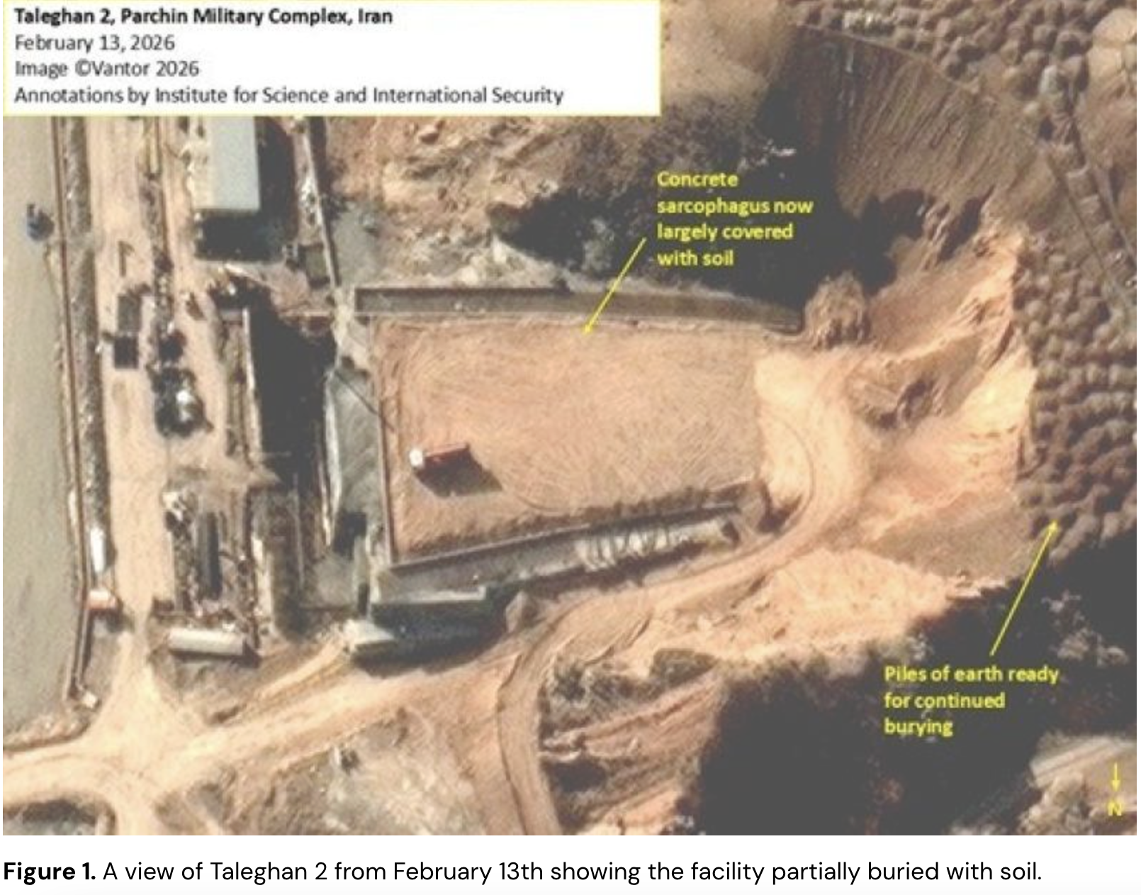 The Islamic Republic has been burying its new Taleghan 2 facility at its Parchin military complex, under construction since May 2025, since at least September 2025. The activity has continued through February, with crews “visibly pouring fresh concrete” around the area and piling soil on top of a structure that likely contains sensitive equipment. Similar efforts are underway at the Esfahan nuclear complex, which the United States and Israel badly damaged in their strikes against the regime’s nuclear program last year. Satellite photos from the end of January show the Islamic Republic “re-burying the southernmost and the middle entrances with soil.”