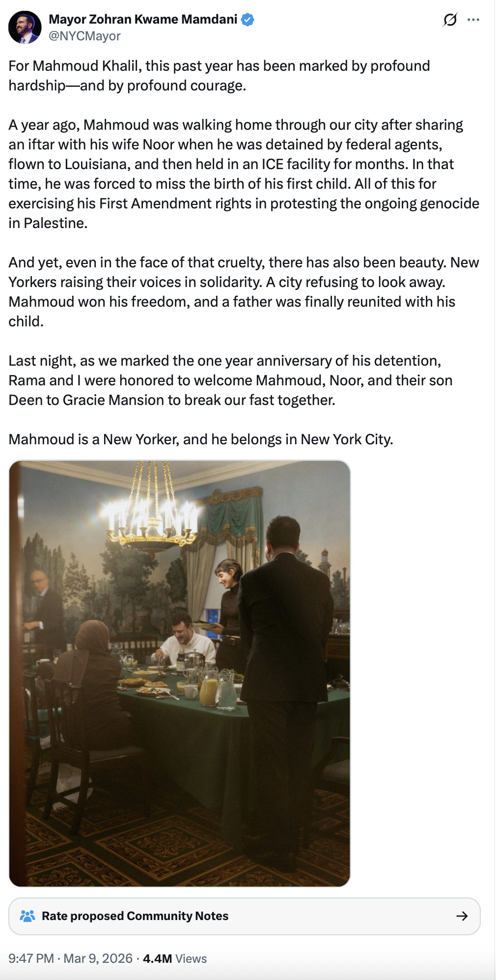 “Last night, as we marked the one year anniversary of his detention, Rama and I were honored to welcome Mahmoud, Noor, and their son Deen to Gracie Mansion to break our fast together,” Mamdani wrote Monday evening. “Mahmoud is a New Yorker, and he belongs in New York City.”
