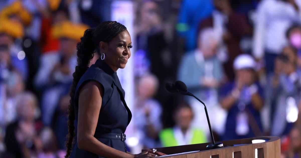 Washington — Former first lady Michelle Obama celebrated Kamala Harris’ presidential candidacy in a speech at the Democratic convention Tuesday, comparing her candidacy to that of her husband Barack Obama’s in 2008.