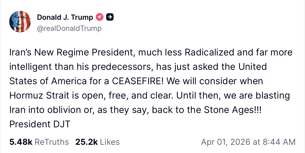 “Iran’s New Regime President, much less Radicalized and far more intelligent than his predecessors, has just asked the United States of America for a CEASEFIRE!” Trump wrote on Truth Social. “We will consider when Hormuz Strait is open, free, and clear. Until then, we are blasting Iran into oblivion or, as they say, back to the Stone Ages!!!”