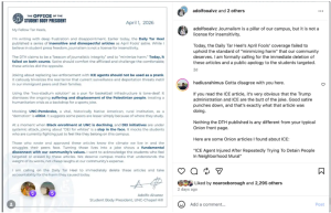 Both current student body president Adolfo Alvarez and incoming president Devin Duncan issued individual statements condemning the ICE satire and calling on the DTH to “immediately delete the articles.”