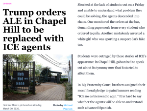 The Daily Tar Heel, UNC’s student newspaper, published its annual satire issue on April 1, featuring an April Fools’ article reporting that “Trump orders ALE in Chapel Hill to be replaced with ICE agents.” The piece, which was harshly critical of ICE, featured a federal agent mistakenly arresting “a white girl who was sporting a suspect dark fake tan,” and fraternity brothers requiring “their most liberal pledge to paint banners reading ‘ICE no es Bienvendio aquí.’” ALE, or Alcohol Law Enforcement, is a state agency despised by many students—the parallels to Immigration and Customs Enforcement are satirical.
