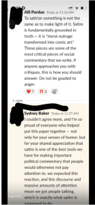 Butler finished her statement with a grammatically tangled flourish: “Real satire is witty criticism of the institutions and actors relevant in the news cycle, most effective when those oppressed by these systems are the authors.”