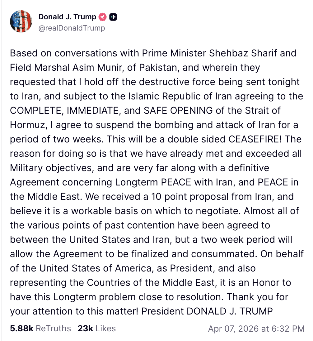 “Based on conversations with Prime Minister Shehbaz Sharif and Field Marshal Asim Munir, of Pakistan, and wherein they requested that I hold off the destructive force being sent tonight to Iran, and subject to the Islamic Republic of Iran agreeing to the COMPLETE, IMMEDIATE, and SAFE OPENING of the Strait of Hormuz, I agree to suspend the bombing and attack of Iran for a period of two weeks,” Trump wrote in a Truth Social post on Tuesday evening. “This will be a double sided CEASEFIRE! The reason for doing so is that we have already met and exceeded all Military objectives, and are very far along with a definitive Agreement concerning Longterm PEACE with Iran, and PEACE in the Middle East.”