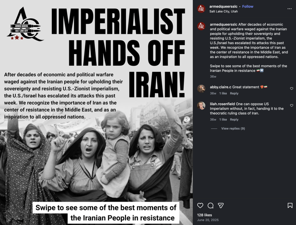 Armed Queers went on to organize “Queers for Palestine” events discussing “Queer & Trans solidarity with Palestinian Liberation.” It called Kamala Harris “the candidate neoliberalism wants you to vote for.” And it identified Iran as “the center of resistance in the Middle East” during the 12-Day War between Israel and the Islamic Republic in 2025, lauding “young people and student organizations” for playing “a major role in the Iranian Revolution.” The group has not highlighted the role of students in the more recent protests against the Iranian regime, nor has it criticized the regime for killing tens of thousands of protesters.