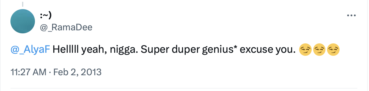 “@_AlyaF Helllll yeah, nigga. Super duper genius* excuse you,” Duwaji posted in February 2013.