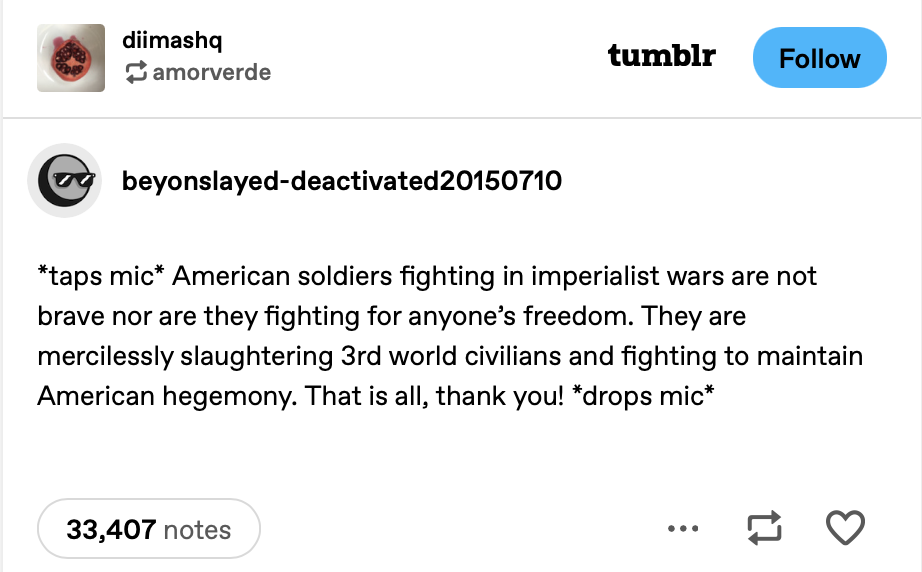 “*taps mic* American soldiers fighting in imperialist wars are not brave nor are they fighting for anyone’s freedom,” the post read. “They are mercilessly slaughtering 3rd world civilians and fighting to maintain American hegemony. That is all, thank you! *drops mic*”
