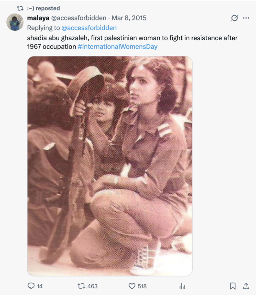 “shadia abu ghazaleh, first palestinian woman to fight in resistance after 1967 occupation #InternationalWomensDay,” the post read.