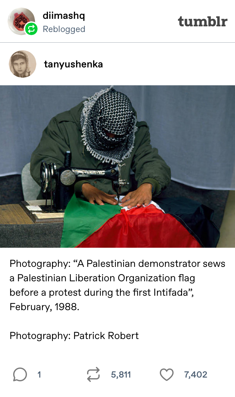 “Photography: ‘A Palestinian demonstrator sews a Palestinian Liberation Organization flag before a protest during the first Intifada’, February, 1988,” the caption reads.