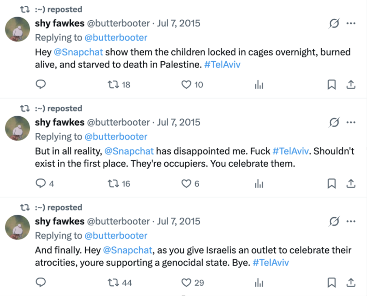 In 2015, the social media app Snapchat added Tel Aviv to its “live story” feature, showing user-submitted photos and videos from a particular location. The decision sparked a backlash from anti-Israel users, including Duwaji, who retweeted a series of posts from an account called @butterbooter.